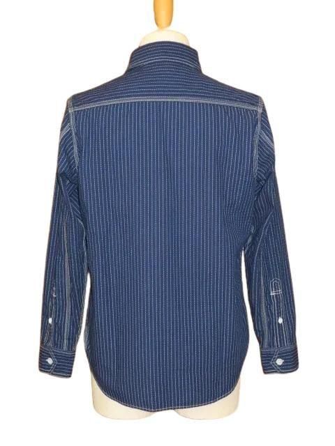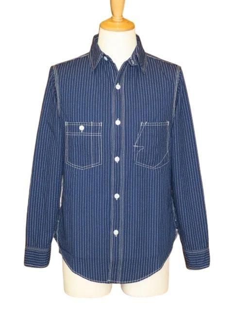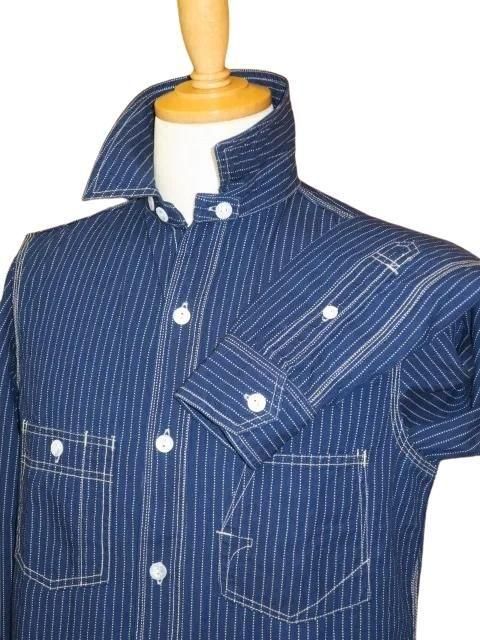 THE IRONALL FACTORIES CO. Cincinnati,Ohio 1920 〜1930s STYLE WORK SHIRT Original Wabash Chambray 1930年代のワークシャツをイメージしたオリジナルのデザインです。 大きめの襟と左右非対称の胸ポケットが特徴的です。 チンストラップは折りたたんでボタン留めできます。 左胸ポケットは懐中時計ポケットで上からも物が収納できる二重構造です。 右胸ポケットはペン挿し付きで、ポケット口裏は生地耳を使用しています。 非常に凝った作りの胸ポケットです。 裾マチにも生地耳を使用しています。 生地はオリジナルのインディゴウォバッシュストライプシャンブレーを使用しています。 生地裏にはSTIFEL ロゴがプリントされています。 ボタンは貝ボタンを使用しています。 ウォッシュ。 インディゴウォバッシュストライプ サイズ: 15.16 サイズ目安 (cm) 15 身幅53 肩幅43.5 着丈72 袖丈62 16 身幅55 肩幅45.5 着丈74 袖丈63.5 誤差はご了承ください