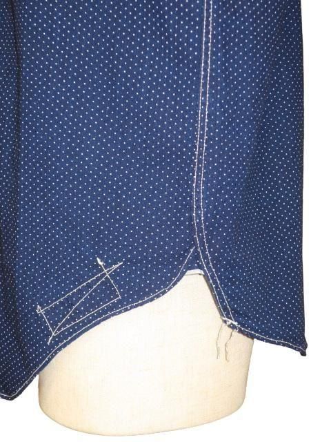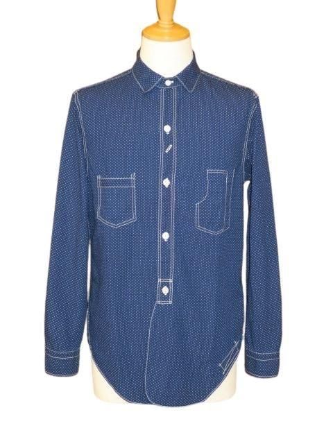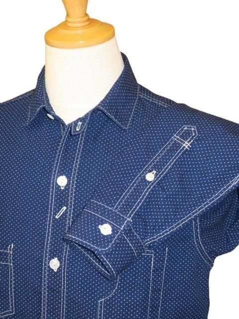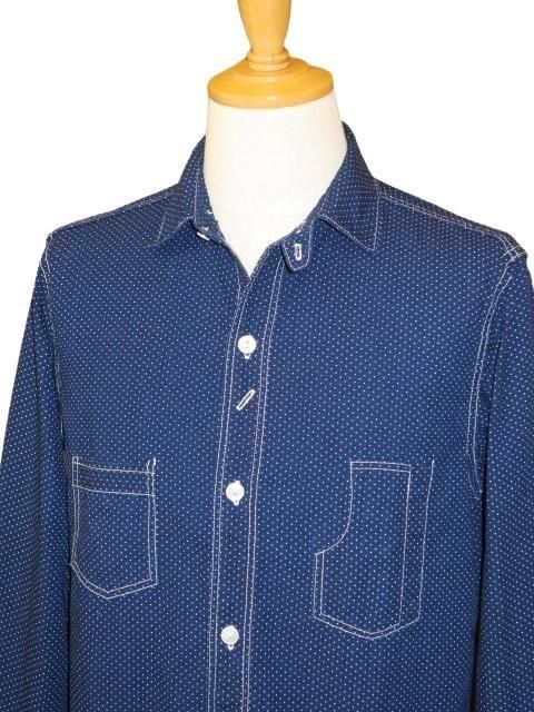 UNION SPECIAL OVERALLS 1910s 〜STYLE WORK CLOTHING Original Polka Dot Indigo Wabash Chambray 1910年代頃のドレスワークシャツをモチーフにしたコンダクターシャツです。 左右非対称の胸ポケットが特徴的で、左胸ポケットは懐中時計用とペン挿しです。 第二ボタン下には懐中時計のチェーンを通す穴があります。 ポケット、カフス、ユニオンチケットの一筆書き縫製やバックヨークの細かいギャザーなど、非常に丁寧な縫製です。 裾の三巻も細く、細かいピッチで縫ってあります。 生地はオリジナルのポルカドットインディゴウォバッシュシャンブレーを使用しています。 生地裏にはSTIFEL ロゴがプリントされています。 裾マチと袖には生地耳を使用しています。 前立て裏側にはリネンシャンブレーで当て布されています。 ボタンは貝ボタンを使用しています。 ウォッシュ。 ポルカドットインディゴウォバッシュ サイズ: 15.16 サイズ目安 (cm) 15 身幅51.5 肩幅43.5 着丈73 袖丈63 16 身幅54 肩幅45.5 着丈74.5 袖丈64 誤差はご了承ください