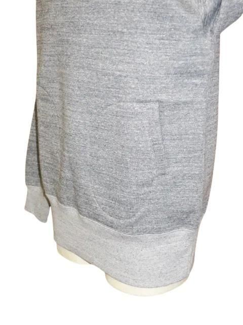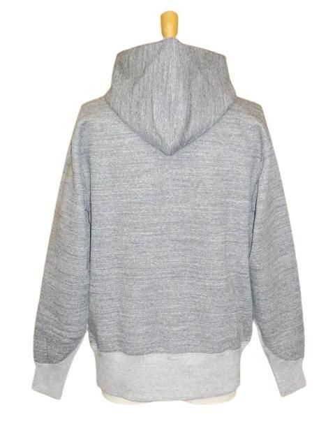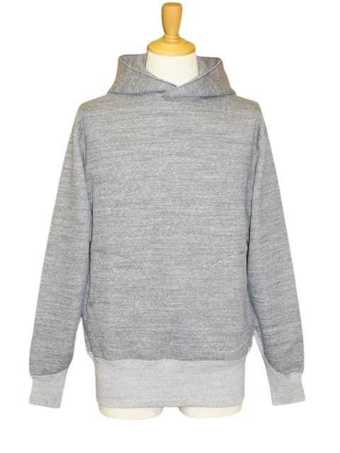 SPECIAL HEAVY WEIGHT 1920 〜1930s STYLE SWEAT PARKA オリジナルのスペシャルヘヴィーウェイト裏起毛地を使用したスウェットシャツです。 1920年代後半〜1930年代のスウェットパーカがモチーフ。 フードは二重で縁はロック縫い仕様です。 グローブ形状のポケット、袖のV形リブが特徴的です。 ボディは丸胴ではなく、両脇に継ぎ目があります。 2本針縫製。 質の高い特殊な綿を用いた強撚でムラが強く太い糸を敢えて使用し、加えて厚さや固さコシを出す為に編み機の微妙なセッティングを幾度も繰り返し編み立てられた素材。更に起毛は通常の2倍以上になるような工程を施し加工。 同ブランドのミディアムウェイト素材と比べ1.4〜1.5倍の重量となり、表面はドライで固く粗野な質感を持ちながらも、裏面は毛足が長く深い起毛感を兼ね備えています。 グレインドチャコールグレー×ミックスグレー サイズ: 38.40.42 38 身幅56 肩幅53 着丈72 袖丈63 40 身幅59 肩幅56 着丈74 袖丈63.5 42 身幅62 肩幅59 着丈76 袖丈64 採寸の誤差はご了承ください 未洗いにつき洗濯後は縮みが生じます