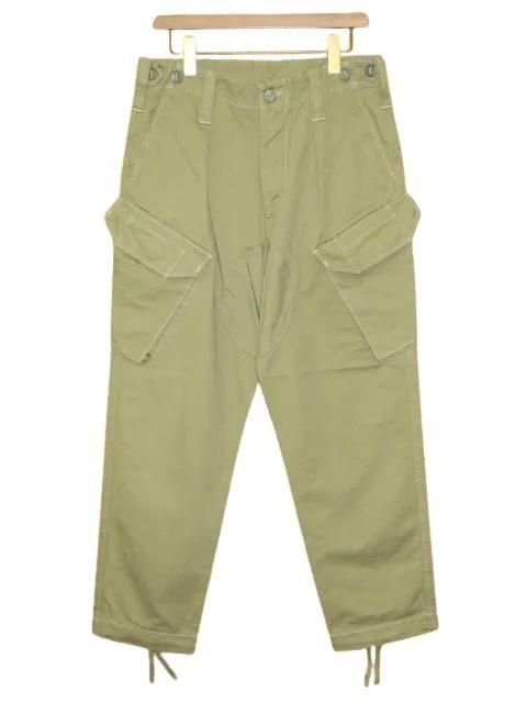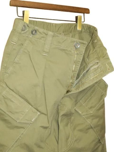 COLIMBO Royal Navy の空母や潜水艦の乗務員が着用していたトラウザーズをモデルにしています。 斜めにサイドポケットのついたタイプ(スラントポケット)になります。 ディテール、カラー共に他のカーゴパンツとはまた違った上品さを感じられるカーゴパンツになっています。 フラップポケットはパラシュートボタン仕様とディティールも特徴的。 ウエストサイドについた左右のゴムのアジャスターで、ウエストサイズの調整が可能。 程よくテーパードした抜群のシルエットは、飽きのこないパンツです。 ウォッシュ。 ・チノクロス(コットン100%) ・フロントジッパー#5WALDES ゴールド ・左インサイドポケットジッパー#3YKK ・尿素ボタン モスグリーン サイズ: M.L サイズ目安 (cm) M ウエスト83 ワタリ34 股下70 裾幅19 L ウエスト88 ワタリ35 股下72 裾幅19.5 誤差はご了承ください