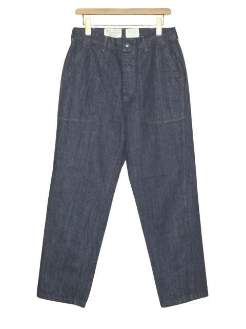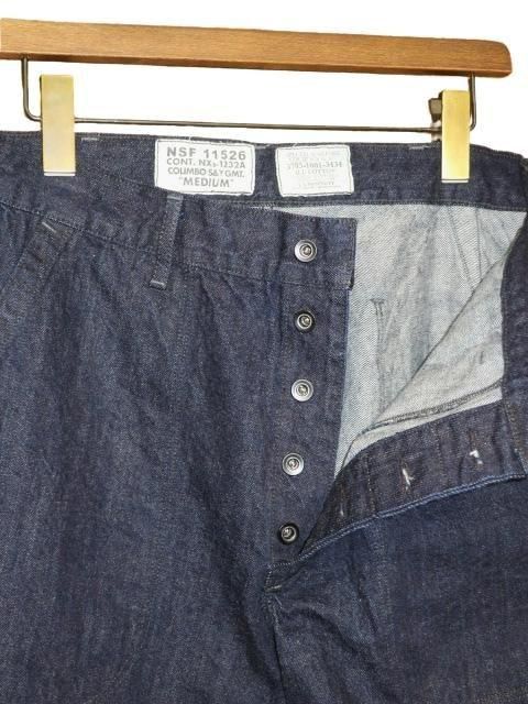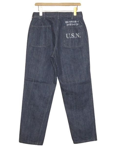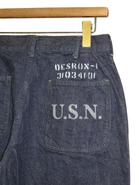 COLIMBO Desron-1 Anti-Submarine Team 右バックポケットとその上にステンシルプリントを施したカスタム仕様です。 1942年以降のギルバート及びマーシャル諸島キャンペーンにて、潜水艦に対抗する装備を拡充した駆逐艦隊が結成された。 大戦中を代表するアメリカ海軍に於けるジェネラルパーパストラウザーズをオリジナル12oz インディゴデニムでモディファイ。 濃色デニムで経年変化も楽しめます。 簡素ながらも丁寧なステッチワークなど、忠実に再現。 ウォッシュ。 ・オリジナル12oz インディゴデニム ・オリジナル鉄製タックボタン インディゴデニム サイズ: M.L サイズ目安 (cm) M ウエスト81 ワタリ34 股上30 股下77 裾幅20.5 L ウエスト86 ワタリ35 股上31 股下79.5 裾幅21 誤差はご了承ください