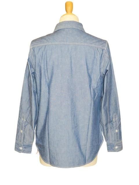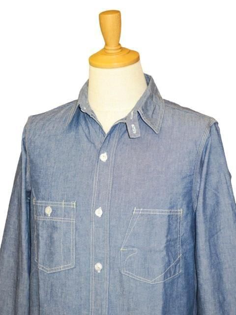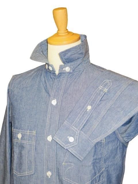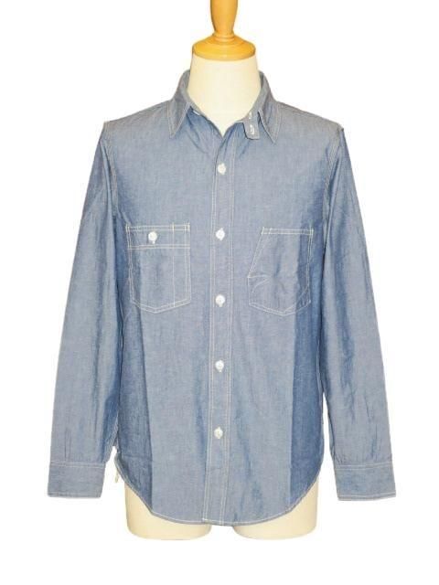 THE IRONALL FACTORIES CO. 1920 〜1930s STYLE WORK SHIRT Original High Density 6.5oz Indigo Chambray 1930年代のワークシャツをイメージしたオリジナルのデザインです。 大きめの襟と左右非対称の胸ポケットが特徴的です。 チンストラップは折りたたんでボタン留めできます。 左胸ポケットは懐中時計ポケットで上からも物が収納できる二重構造です。 右胸ポケットはペン挿し付きです。 非常に凝った作りの胸ポケットです。 生地はオリジナルの6.5オンスインディゴシャンブレーを使用しています。 高密度織りのハリコシがあるシャンブレーです。 ボタンは貝ボタンを使用しています。 ウォッシュ。 インディゴシャンブレー サイズ: 15.16.17 サイズ目安 (cm) 15 身幅53 肩幅44 着丈73.5 袖丈63.5 16 身幅56 肩幅46 着丈75.5 袖丈64.5 17 身幅59 肩幅48 着丈77.5 袖丈65.5 誤差はご了承ください