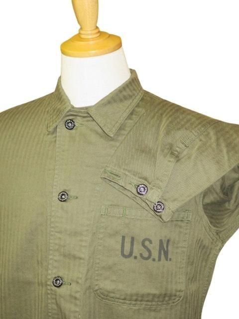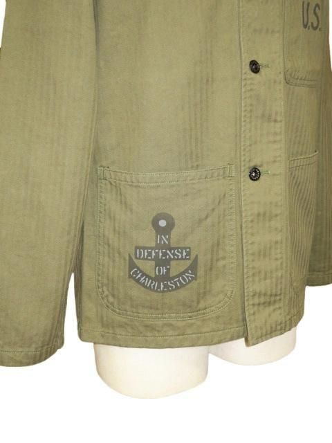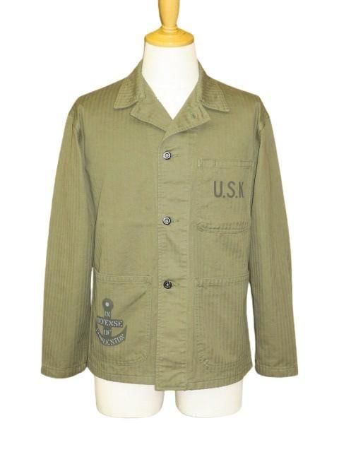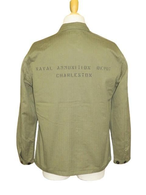 U.S.NAVY N-3 TYPE NXsx-34101 いわゆるカバーオールディテールを持つミリタリーワークジャケット。 大戦中から各軍それぞれ支給をしていたが米海軍版はN-3と呼ばれる。 堅牢なヘリンボーンツイルで仕立てられたそれらは基地内でのジェネラルワークシーンや時には艦艇内においても着用された。 サウスカロライナ州のANジョイントベースであったチャールストン基地はNAD(海軍弾薬庫) として重要なポジションでもあった。 ステンシル加工によるマーキングと戦時中の同基地スローガンデザインが施される。 ウォッシュ。 ・力織機織りヘリンボーンツイル ・オリジナル月桂樹鉄製タックボタン(ラッカー塗装、エイジング加工) オリーブドラブ サイズ: M.L.XL サイズ目安 (cm) M 身幅55.5 肩幅50 着丈70 袖丈58 L 身幅58 肩幅52 着丈72.5 袖丈59 XL 身幅61 肩幅54 着丈75 袖丈60 誤差はご了承ください
