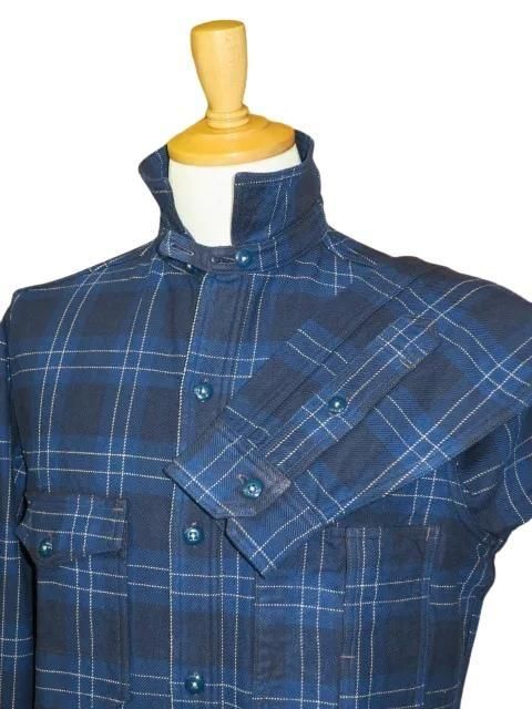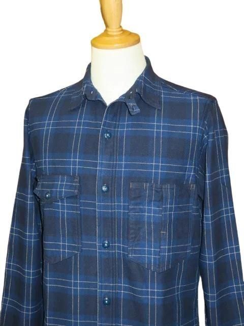 MECHANIC SHIRT UNION SPECIAL OVERALLS 1930s STYLE WORK CLOTHING Original Cotton Flannel Check With a Raised Back 1930年代のメカニックワークシャツをイメージしたブライストーンです。 チンストラップ付きでチンストラップを留めるためのボタンも台襟に付いています。 左右非対称の胸ポケットが特徴的です。 左胸ポケットはペン挿し付きの懐中時計ポケットで、上からも物が収納できる二重構造です。 右胸ポケットの裏下部分は別布で補強してあります。 生地はオリジナルの裏起毛のコットンフランネルチェックを使用しています。 ボタンは尿素ボタンを使用しています。 ウォッシュ。 ダークベネチアンブルー×ダークネイビー×ベージュ サイズ: 15.16.17 サイズ目安 (cm) 15 身幅53 肩幅42.5 着丈72.5 袖丈62 16 身幅56 肩幅45 着丈75 袖丈63 17 身幅59 肩幅47 着丈78 袖丈64 誤差はご了承ください