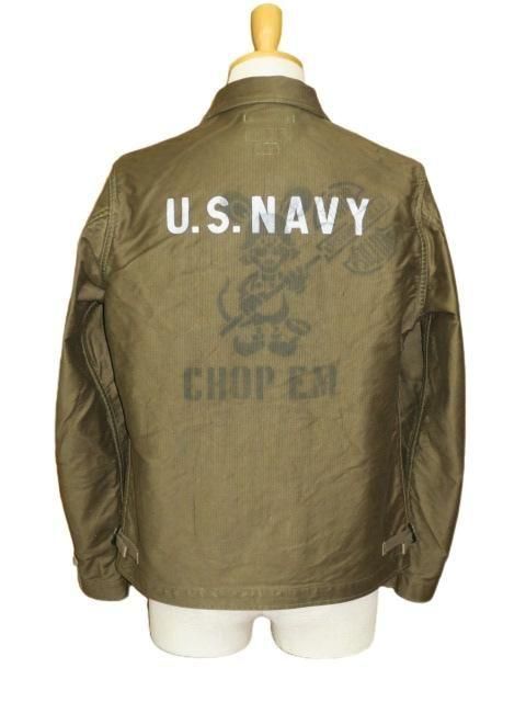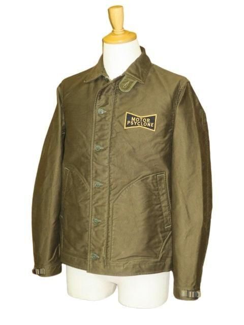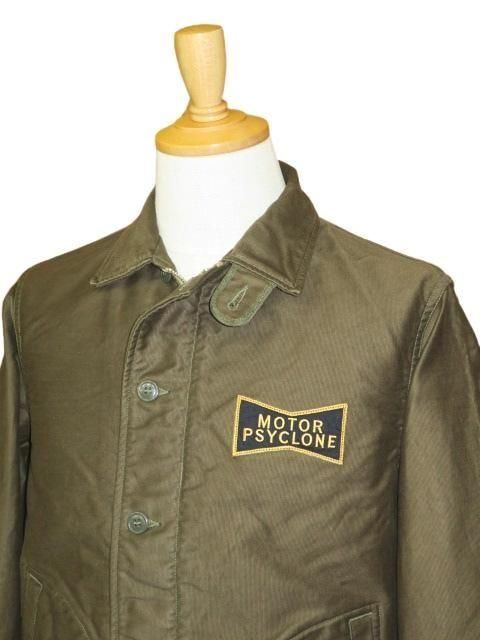 DECK WORKER JACKET MOTOR PSYCLONE GARAGE SERIES FREEWHEELERS LABEL 1940 〜1950s U.S.NAVY MILITARY & MOTOR CULTURE IMAGE CUSTUM JACKET Original High Density Jungle Cloth モーターカルチャーをイメージしたカスタムジャケットです。 左胸にモーターサイクロン刺繍パッチが付きます。 背中にはU.S.NAVY リフレクタープリントの上にエアブラシプリントが入ります。 ベースはデッキワーカージャケットです。 フロントはボタンとジッパー仕様です。 袖口と腰にはハシゴバックルのストラップが付き、サイズ調節できます。 生地はオリジナルのジャングルクロス(裏起毛あり)を使用しています。 高密度織りでハリコシのある生地です。 フロントジッパーはWALDES ダブルジッパーを使用しています。 ボタンは尿素ボタンを使用しています。 ウォッシュ。 ダークカーキグリーン サイズ: 38.40.42 サイズ目安 (cm) 38 身幅54.5 肩幅43 着丈66 袖丈64 40 身幅57 肩幅45 着丈68 袖丈64 42 身幅60 肩幅47 着丈70 袖丈65 誤差はご了承ください