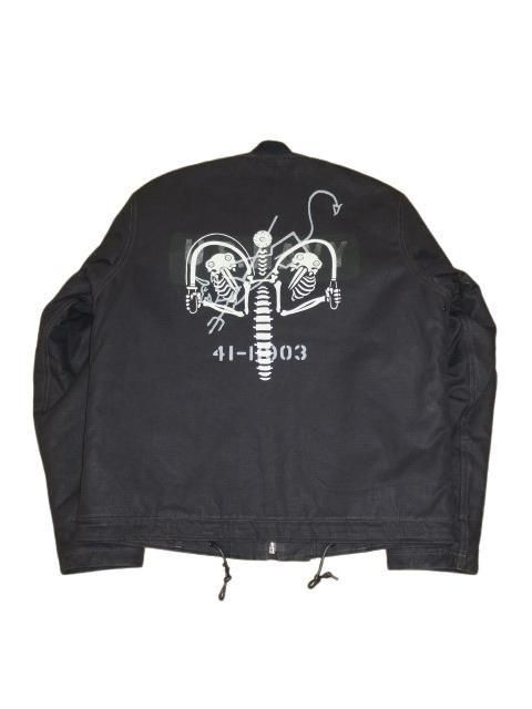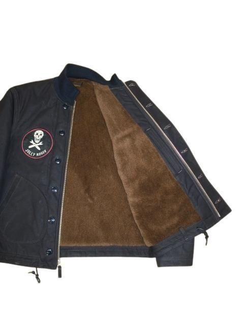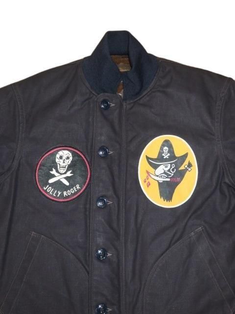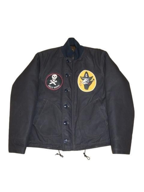 FREEWHEELERS 2025秋冬 CIVILIAN DECK JACKET UNION SPECIAL OVERALLS LATE 1940 〜1950s MILITARY & MOTOR CULTURE IMAGE CUSTUM JACKET Original Cotton Duck Dry Finish Lining:Original Red Brown 100% Alpaca Pile 左胸にはブラックパイレーツの4色ラバープリントが施してあります。 右胸にはジョリーロジャーのフェルト地の刺繍パッチが付きます。 背中にはU.S.NAVY リフレクタープリントを黒く塗りつぶした上にAAF 90thBG 400thBSQ をプリント、さらにナックルヘッドをモチーフにしたバイクモンスターのラバープリントが施してあります。 ベースは1940年代のデッキジャケットのシビリアンモデルをイメージしています。 表地にオリジナルのコットンダックを使用しています。 裏地にはオリジナルの赤茶色のアルパカパイル100%を使用しています。 表地と裏地の間にコットンネルを挟んだ三層構造で、保温性、遮風性に優れています。 袖口にはウールリブとアルパカパイルが付きます。 ボタンは尿素ボタンを使用しています。 ダークネイビー サイズ: 38.40.42 サイズ目安 (cm) 38 身幅56 肩幅47 着丈64 袖丈63.5 40 身幅59 肩幅49 着丈66 袖丈64 42 身幅62 肩幅51 着丈68 袖丈64.5 誤差はご了承ください