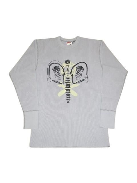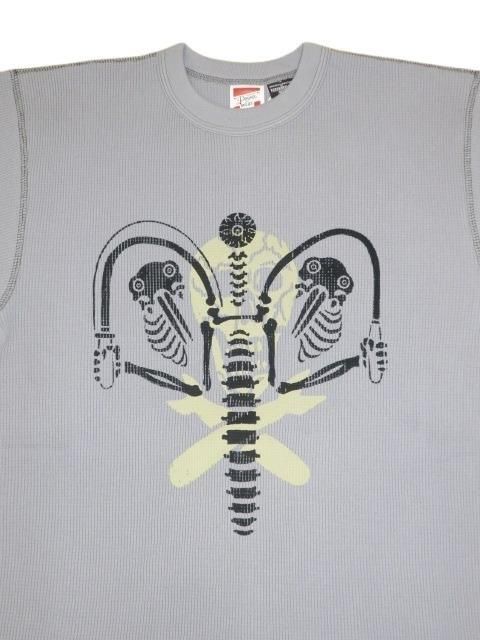 FREEWHEELERS 2025秋冬 CREW NECKED THERMAL LONG SLEEVE SHIRT 1950s STYLE UNDERWEAR Vintage Style Medium Weight Waffle Knit ジョリーロジャーの上にナックルヘッドをモチーフにしたバイクモンスターのプリントが施してあります。 プリントはラバープリントです。 ミディアムウェイトワッフルを使用したクルーネックサーマルシャツです。 伸縮性、保温性に優れインナーに最適です。 ノンウォッシュ。 ミディアムグレー サイズ: M.L サイズ目安 (cm) M 身幅43 着丈65 L 身幅46 着丈68 誤差はご了承ください