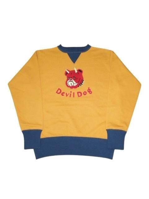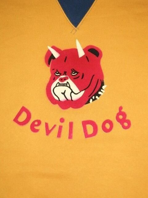 FREEWHEELERS 2025秋冬 DOUBLE V SWEAT SHIRT 1930 〜1940s STYLE SET-IN SLEEVE SWEAT SHIRT Vintage Style Medium Weight Fleece デビルドッグをモチーフにしたデザインです。 ビンテージフロッキープリントを施し、その上にエアブラシプリントを施した手間のかかるプリント技法です。 ベースは1940年代頃の両Vセットインスウェットシャツがモチーフ。 オリジナルのミディアムウェイト裏起毛を使用しています。 ボディは丸胴ではなく、両脇に継ぎ目があります。 2本針縫製。 ノンウォッシュ。 オールドゴールド×ディープブルーベリー サイズ: 38.40.42 サイズ目安 (cm) 38 身幅53 肩幅46 着丈64 袖丈63 40 身幅56 肩幅48 着丈66 袖丈63.5 42 身幅59 肩幅50 着丈68 袖丈64 誤差はご了承ください 未洗いにつき洗濯後は縮みが生じます